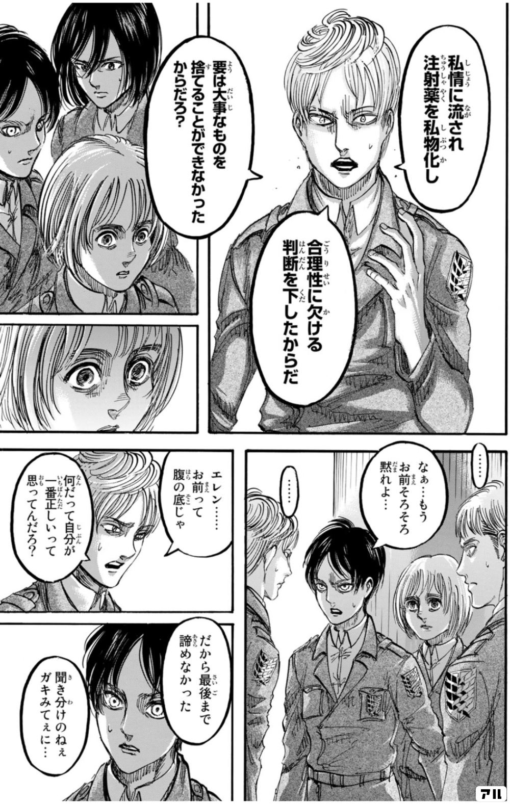 私情に流され 注射薬を私物化し 合理性に欠ける判断を下したからだ 要は大事なものを 捨てることができなかったからだろ なぁ もうお前そろそろ黙れよ エレン お前って腹の底じゃ 何だって自分が一番正しいって思ってん